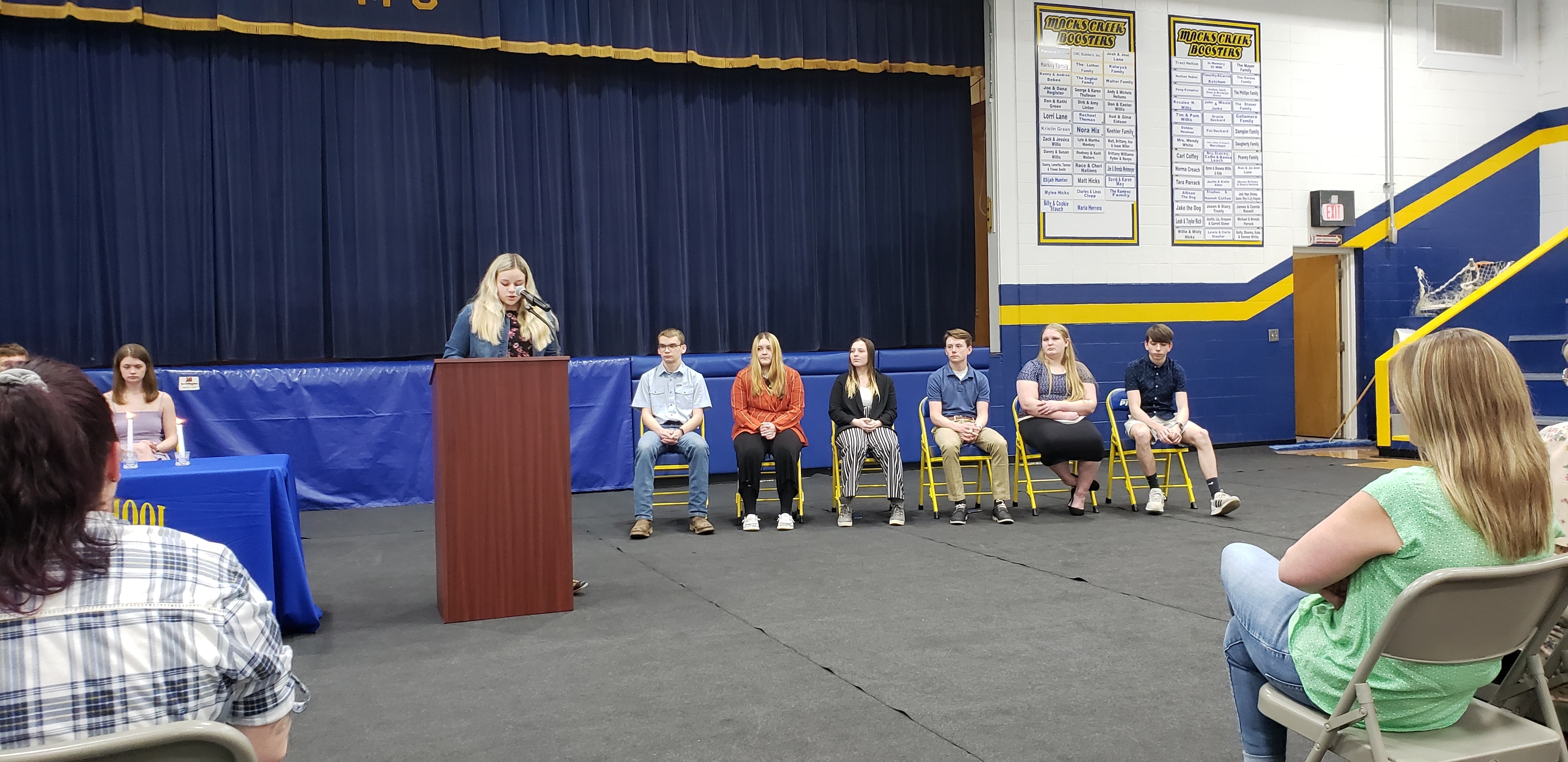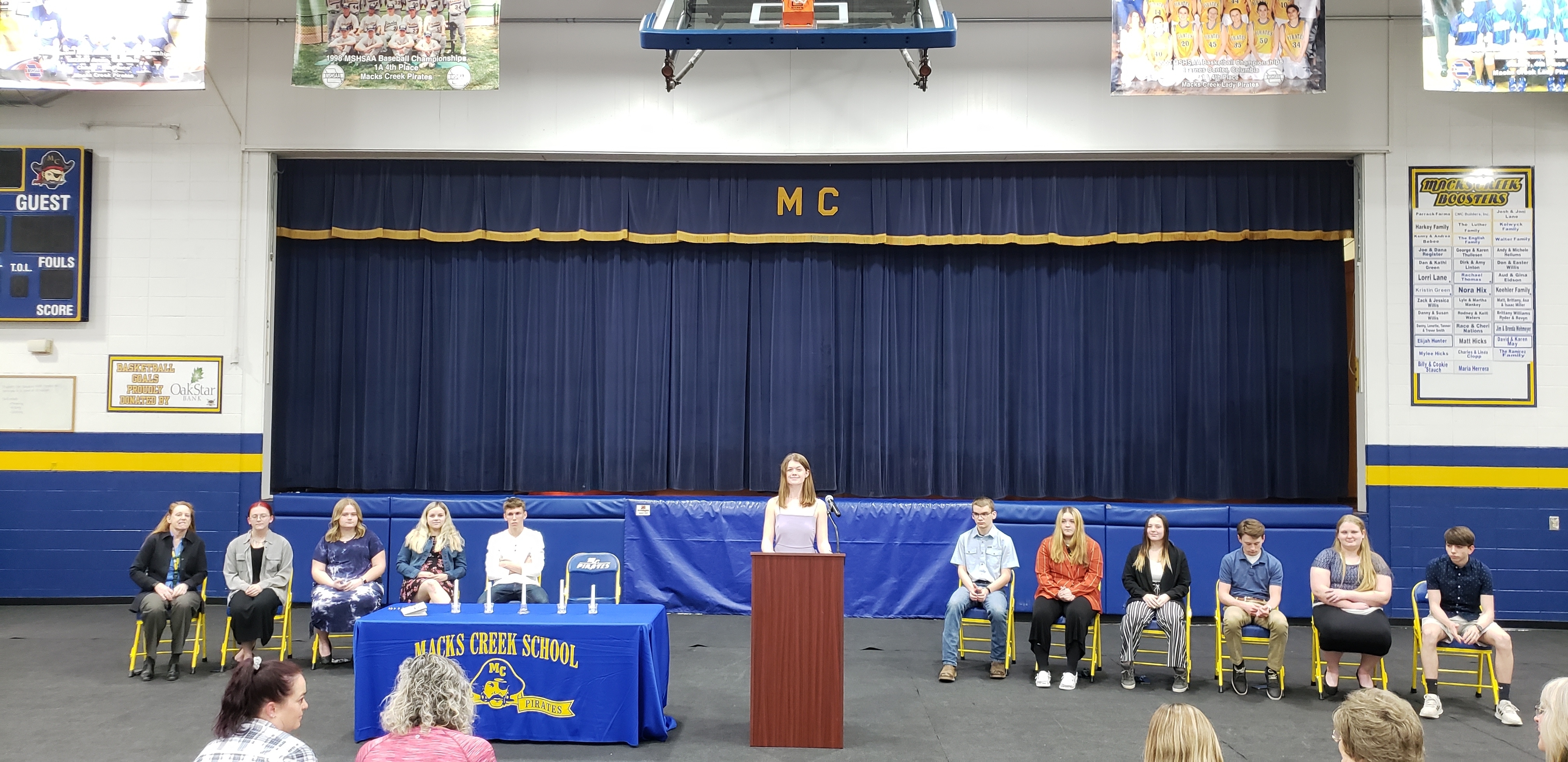 The Macks Creek Chapter of the National Honor Society hosted an induction ceremony this evening. Congratulations to Lowell Charlton, Cameron Kates, Ashlee Klinksick, Leanna Tower, Caleb Phillips and Chase Whitworth! These new inductees have pledged to uphold the society's four pillars of scholarship, service, leadership and character.